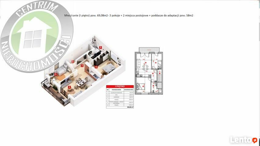 Do mieszkania przynależy poddasze o pow. 58m2 z możliwością adaptacji na cele mieszkalne oraz 2 miejsca postojowe znajdujące się w bezpośrednim sąsiedztwie mieszkania.